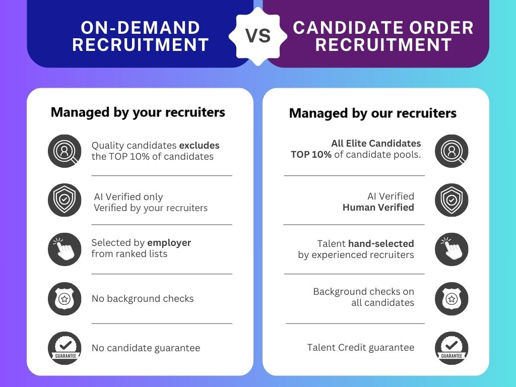 The Talent Marketplace connects employers to matched candidates. Employers can find talent with their own searches and employ in minutes. Alternatively employers can engage our experienced recruiters to find elite candidates.