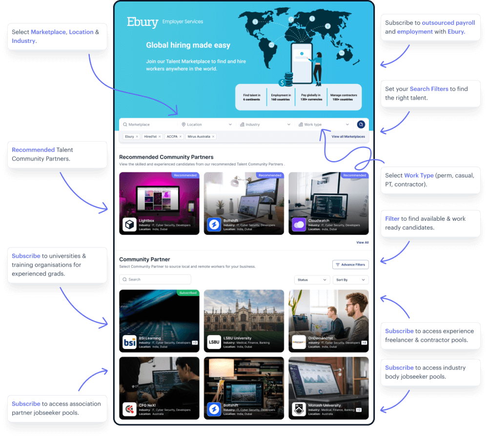 Marketplace Partners – our global partner networks provide access to employers looking to hire talent. We work with Industry associations, HR & IT consultants, workforce solutions, and leading edge technology solutions